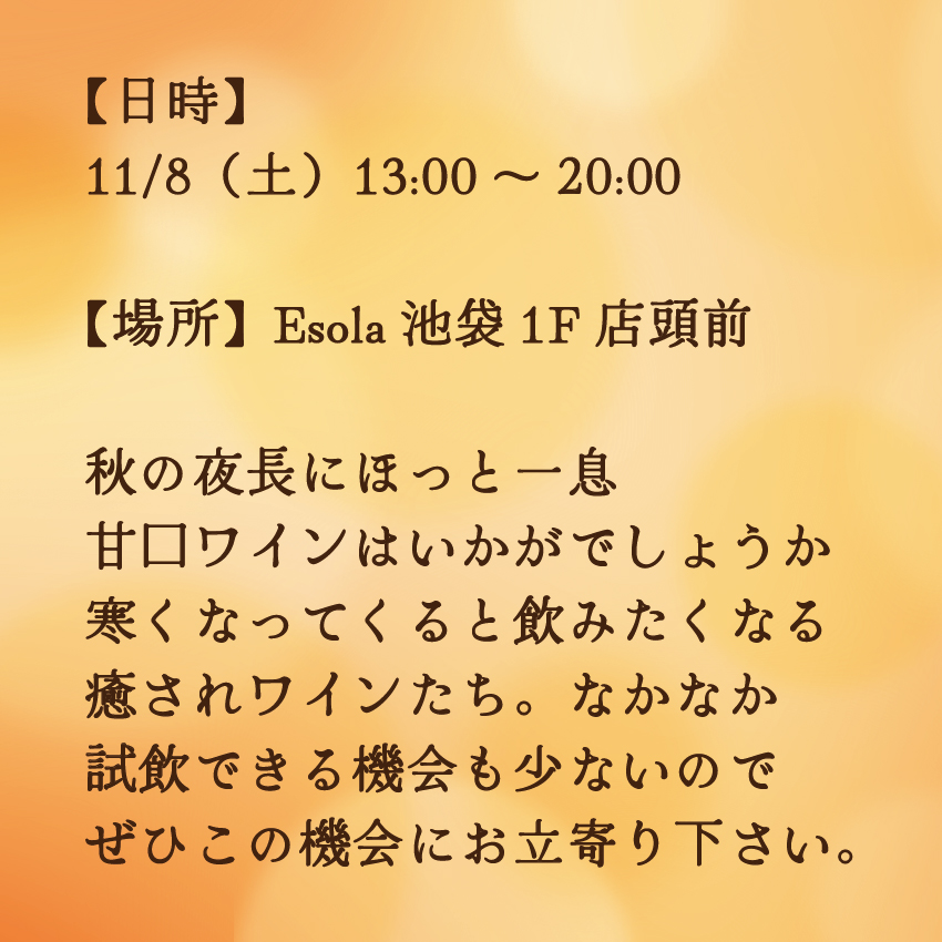 なかなか甘口ワインを試飲できる機会が少ないので ぜひこの機会にお立寄り下さい。