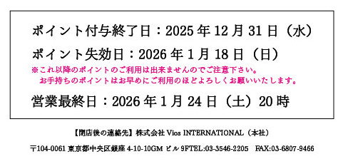 また、購入ポイント付与、バースデーポイント付与、につきましては2025年12月31日をもって 配信を停止させていただきます。ご迷惑をおかけいたしますが、何卒ご理解のほどよろしくお願い申し上げます。